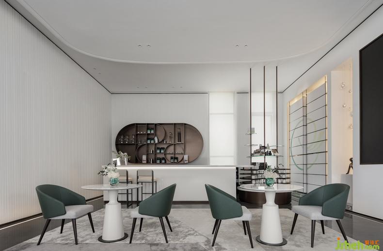 洽談區(qū)與水吧歸為一處,整體空間延續(xù)著自然的舒適調(diào)性,以灰白調(diào)為主,點綴的綠色從家居到綠植裝飾相互呼應,與吧臺背景中的做舊古銅置物架一并,調(diào)和出悠揚愜意的室內(nèi)氛圍。