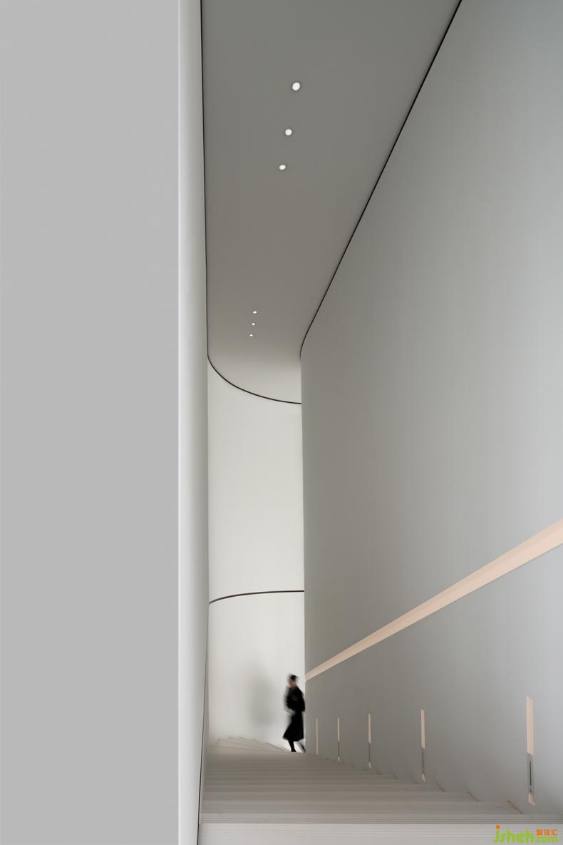 沿書吧一側(cè)的環(huán)形螺旋樓梯上升,仿佛進入了一方神秘深谷之中,兩側(cè)連續(xù)的墻面大面積留白,高挑空的設計,形成更具藝術(shù)感的空間體驗。