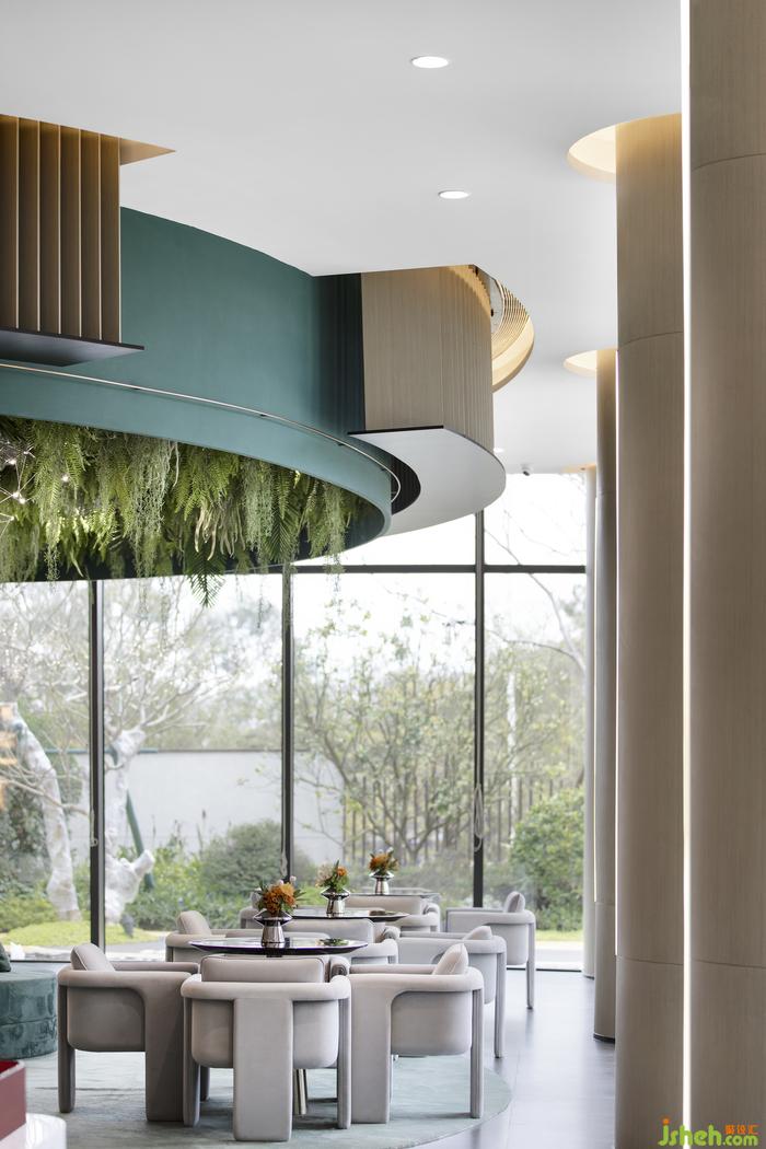整體以木色為主基調(diào),搭配生機(jī)勃勃的翠綠喚醒空間,售樓處設(shè)計(jì)與淡雅的灰綠色家具相互呼應(yīng),在有限的空間里,形成自然與人居空間的滲透循環(huán),營(yíng)造輕松舒適的洽談氛圍。
