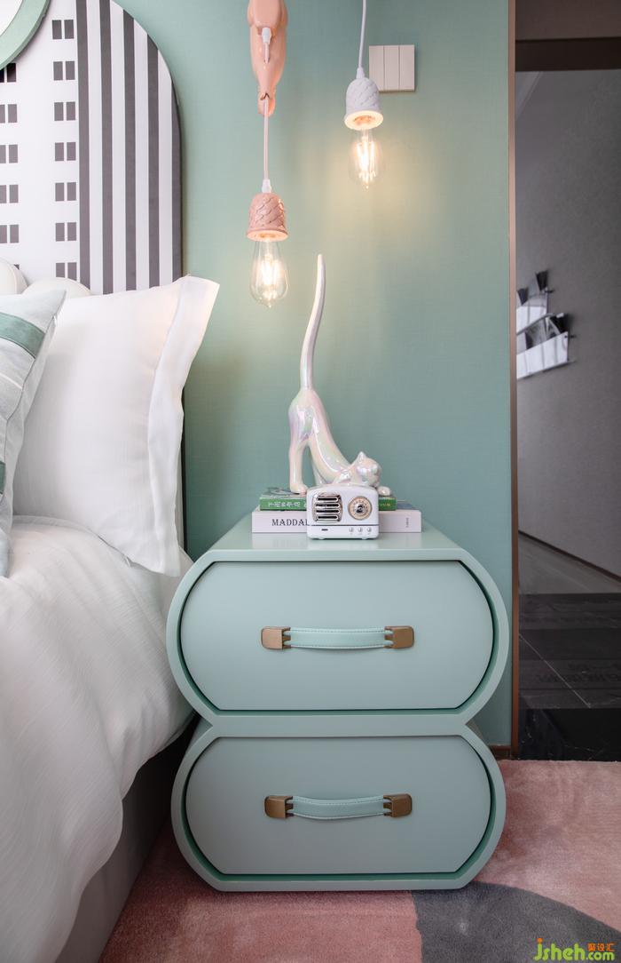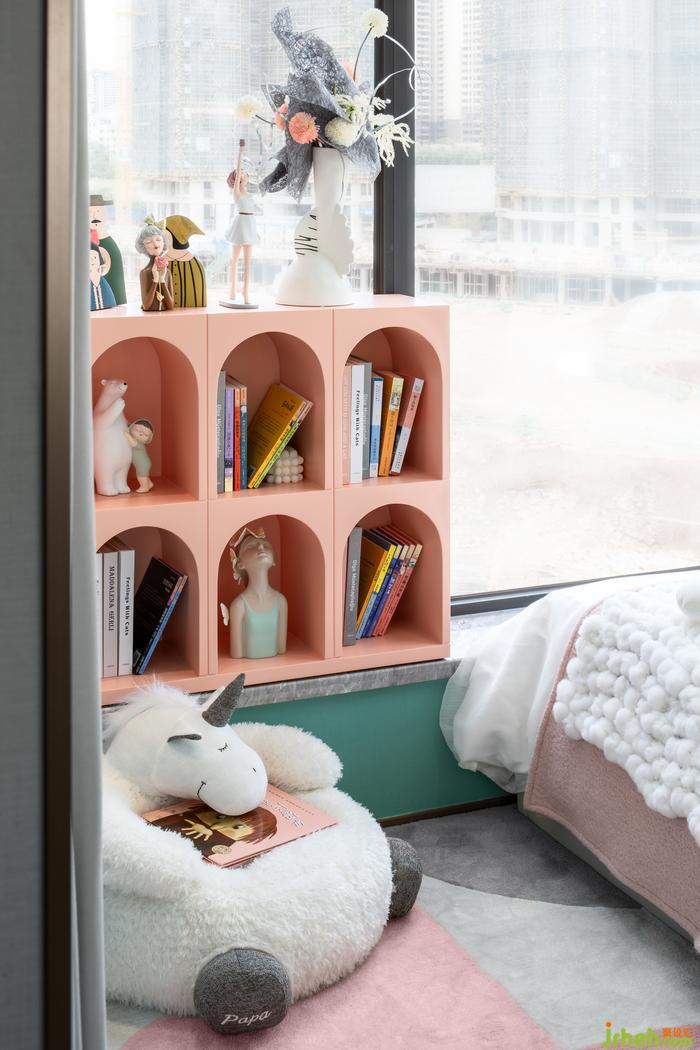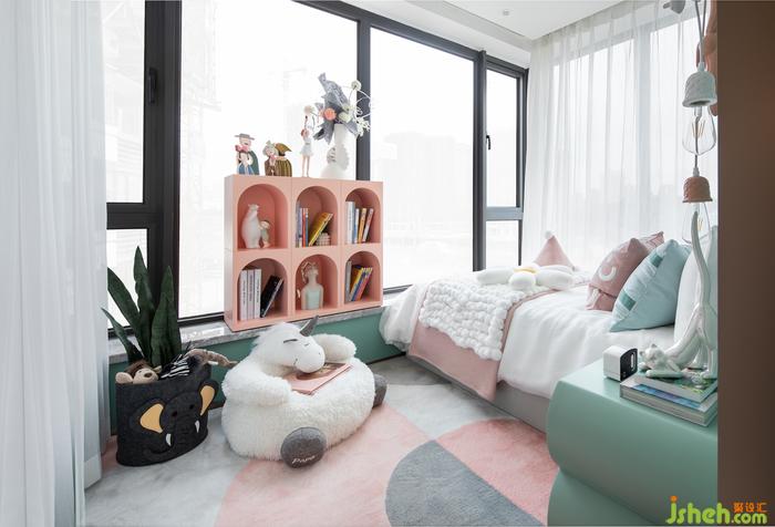 女孩房營造一個(gè)舒適溫暖的環(huán)境,馬卡龍系色調(diào)撲面襲來,甜美色彩搭配活潑童趣的裝飾,散發(fā)著天真可愛的小公主氣息。樣板房設(shè)計(jì)別致的獨(dú)角獸座椅承載著對(duì)小主人美好的希冀,象征無憂無慮的追逐夢(mèng)想。