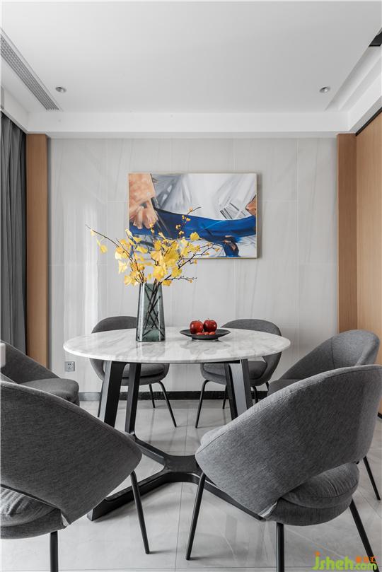 餐廳受戶型局限,空間不大,于是在設(shè)計上我們做減法處理;無論是造型、天花空調(diào)的出風(fēng)口還是無主燈的設(shè)計,都是為了空間在視覺上更加的規(guī)整、通透。