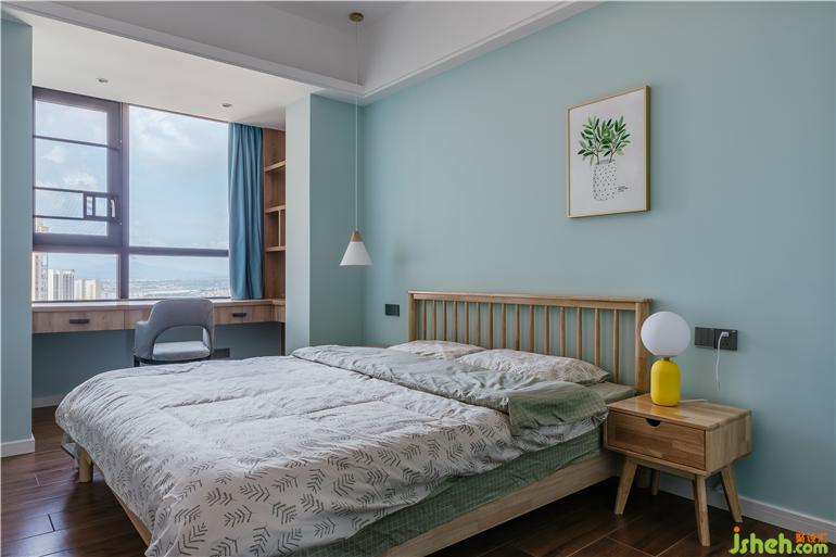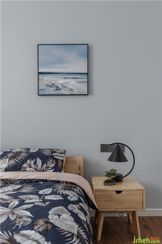 墻面選用Tiffany(蒂芙尼)藍,床品、掛畫延伸整個主題色,檸檬黃的臺燈成了這個寧靜空間跳動的音符。
