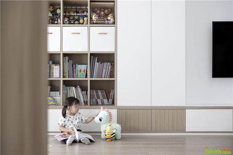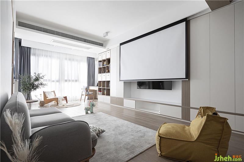 收納對于一家三代人來說太重要了。滿墻的柜子里面除了書,就是收納盒裝好的雜物。電視背景墻的柜子是白色模壓門,手按一下,門板就能彈開,比安裝門把手簡潔又美觀。南京裝修設(shè)計客廳里還安裝了幕布,直接可以隱藏在吊頂里。有時候陪孩子靠在沙發(fā)上看看電影增進(jìn)親子關(guān)系也是極好的。