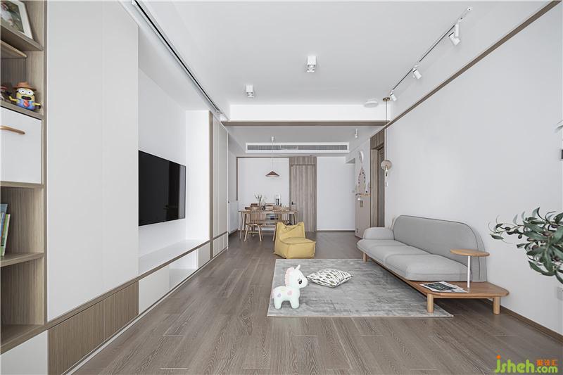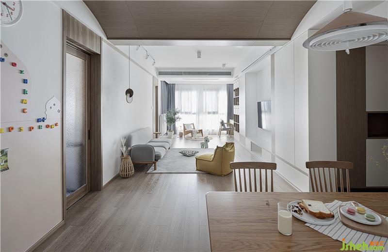 客廳里沒有茶幾,因為孩子相對比較小,喜歡在家里跑來跑去, 如果茶幾放中間就相對礙事了。整個餐廳客廳都是選的地板材質(zhì),看起來溫馨一些,業(yè)主說,酷酷的家還是等孩子長大以后裝修再弄,孩子小溫馨點更重要。