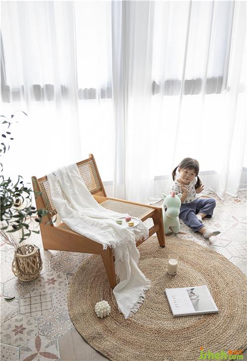 陽臺和客廳的結(jié)合,能讓空間看起來大了許多,這樣提供給孩子足夠玩耍瘋跑的空間。 原來陽臺是落地窗,采光也非常的好,因為樓間距不是很大,站在陽臺就可以直視對面鄰居家的廚房,所以沒有選擇那種薄而透的白紗,業(yè)主通過和設(shè)計師一起挑選,選了稍微能遮擋隱私的紗,也能遮擋夏日陽光強(qiáng)烈的照射。 陽臺上放了一把木質(zhì)藤椅和圓形地毯,老人在孩子每天送去幼兒園以后,閑暇時就坐在這里看看書,曬曬太陽。偶爾也是小朋友愛玩的地方呢。 陽臺用了六邊磚和地板的拼接方式,美觀又實用。