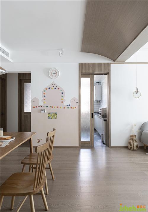 墻面上粉色的城堡造型是磁吸黑板墻哦,可以讓孩子用畫畫記錄開心的事情。 廚房的門采用木質(zhì)移門,擔(dān)心透明玻璃能看到廚房的雜亂,用了鉆石磨砂玻璃。 頂上的弧形造型頂使得整個空間柔和了。