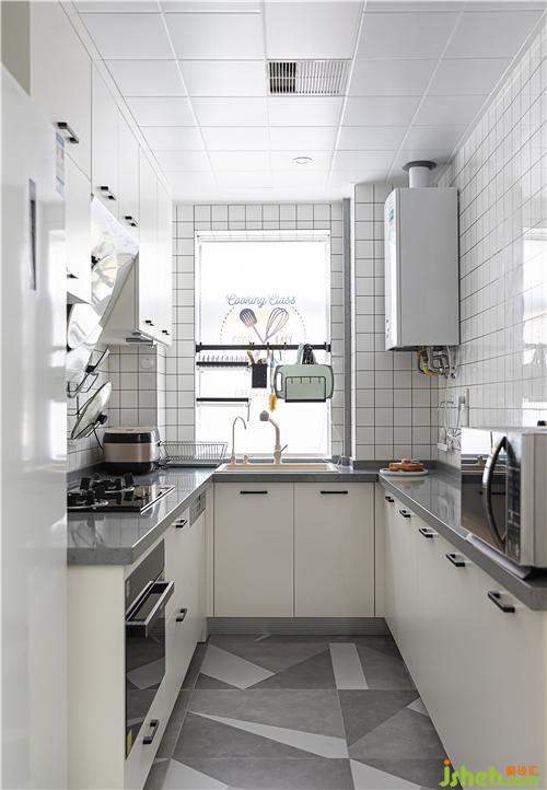 廚房里設(shè)計了U型柜,讓這個不大不小的廚房增加了很多收納空間。廚房的窗戶上裝了一個黑色桿子,這樣零散的物件就可以掛上去,也不影響采光,實用又不失美觀。柜子用了米色平板門配灰色石英石。非常的方便弄衛(wèi)生,一年365天,基本天天都在家里做飯,廚房的使用頻率實在是高,灰色的臺面相對來說比較方便打理。廚房墻面的磚用的是300*600的磚,上面有好多100*100的小方格子。