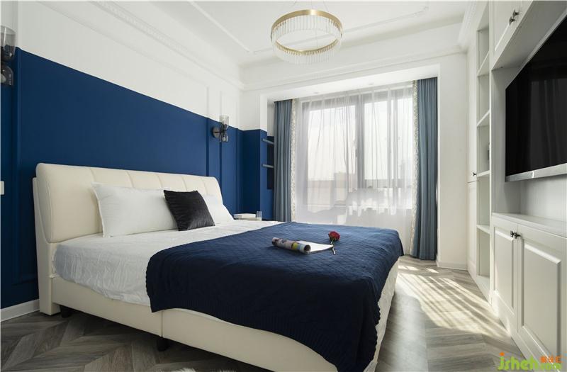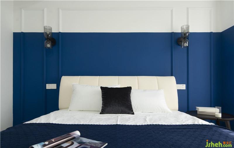 主臥室背景墻上沒有用太多的裝飾,幾根線條和藍色乳膠漆修飾。灰色玻璃壁燈不搶眼,但是很低調(diào)的裝飾了墻面。