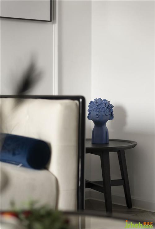 這是攝影師取了個近景,茶幾好物,黑色邊框茶幾上,擺放了兩個白色的陶瓷罐子,上面插了根羽毛,是既低調(diào)又愛俏。