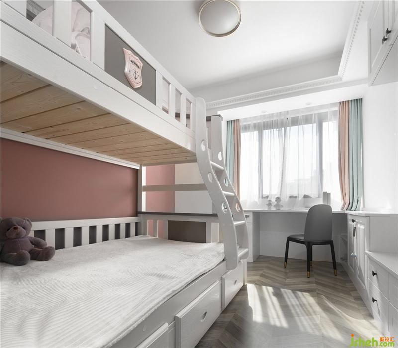 暗粉色的墻面漆搭配了白色的高低床,一猜就知道是小女孩的房間。書桌那邊原來是飄窗的位置。