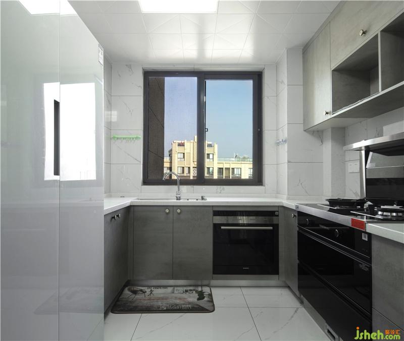 廚房水泥面的柜門配上白色的瓷磚,簡約明亮,白色的大地磚鋪貼到墻上,方便擦拭油煙,地面也選用了同一款顏色,如果地面有臟,一眼就能看到,方便清掃。頂上也是選用了最簡單的白色集成吊頂。廚房的總寬度2.6米,一邊0.6米寬的柜子,中間過道還有1.4米左右,很寬敞哦。