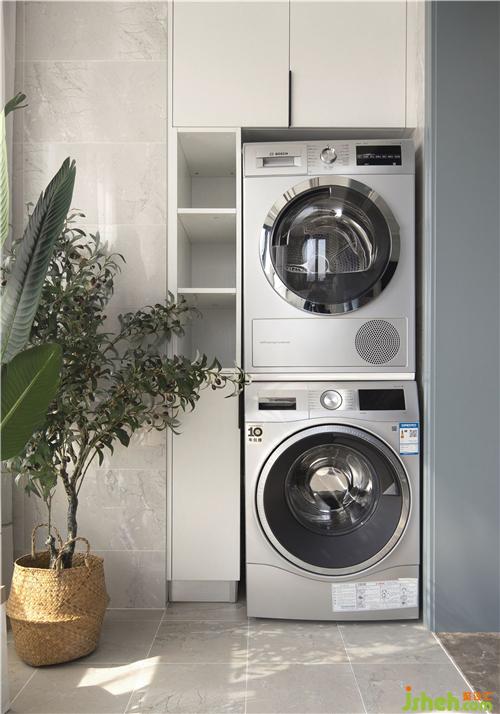 陽臺的洗衣間和烘干機(jī)疊加一起,上面和側(cè)面做了收納柜吊柜可以放不常用的物品,側(cè)面柜放洗衣粉和衣架之類的。柜子 選擇了最簡單的白色。洗衣機(jī)和柜子的寬度只有1米,不夠把洗衣池放過來,洗衣池放陽臺另外一邊。