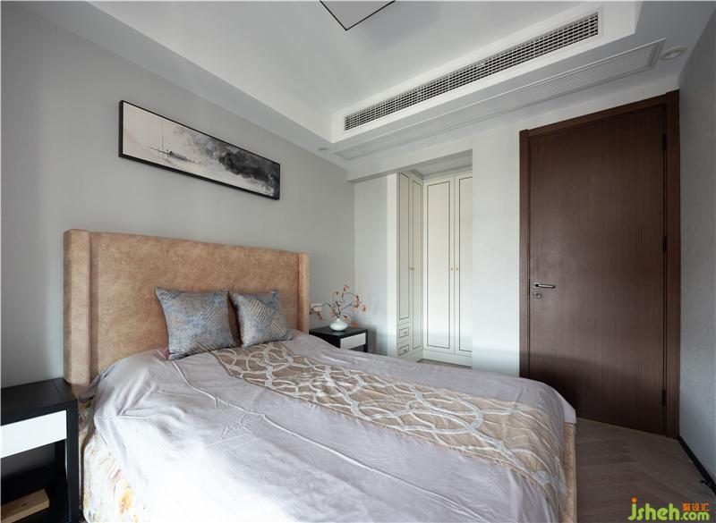 次臥風(fēng)格和主臥一致,背景里一副《云深霧間一橫舟》很有意境。