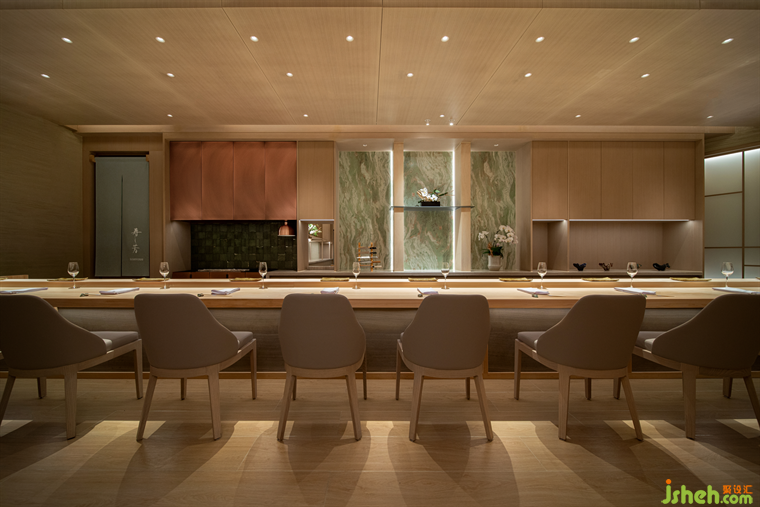 包間中心以開放式廚房結(jié)合壽司臺(tái),日料餐廳設(shè)計(jì)以板前料理形態(tài)服務(wù)。次第排列的弧形椅宛如一座座島嶼,一與十,方與圓,主與客,施與受,空間的起承轉(zhuǎn)合也是人與人、人與物之間關(guān)系的進(jìn)一步詮釋。
