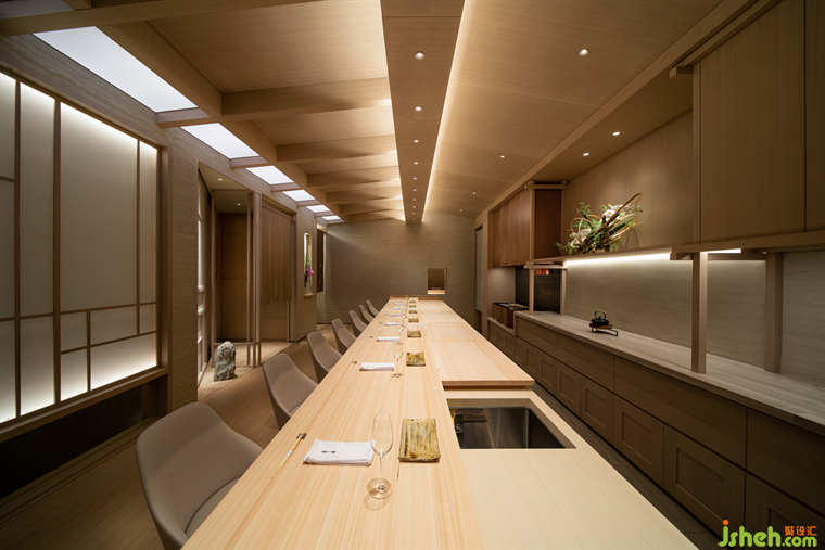 這個(gè)空間充分運(yùn)用了木元素,左側(cè)大面積的假窗設(shè)計(jì)通過與天花的燈光結(jié)合,日料餐廳設(shè)計(jì)巧妙地營(yíng)造出薄霧的效果。其中,三間包房中,假窗最大,通過假窗和天花的燈光結(jié)合,巧妙地營(yíng)造出薄霧的效果。