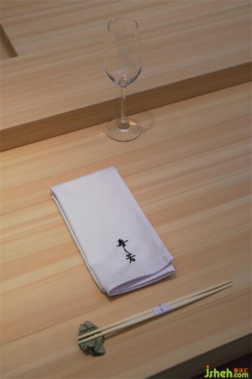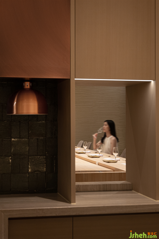空間細節(jié)上的巧思妙想,遠不僅于此。板前料理的壽司臺采用的一塊檜木,不經(jīng)打磨與拋光,以保留其天然的紋理、質(zhì)感和痕跡,日深月久,再以日本傳統(tǒng)的刨木工藝,將表面木層刨去,使之恢復(fù)干凈,宛如歲月的洗禮。
