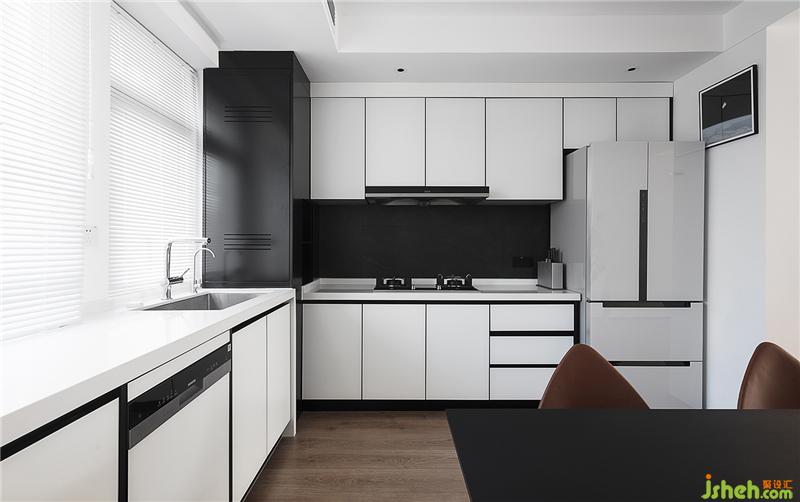 純白造型的定制櫥柜,黑色線條作為造型的一部分,完美的表達(dá)了現(xiàn)代風(fēng)廚房的側(cè)重點(diǎn),注重功能簡化裝飾,在空間區(qū)域的劃分上更加清晰??臻g寬闊而不狹窄,整體風(fēng)格和整個(gè)家和諧的融為一體。