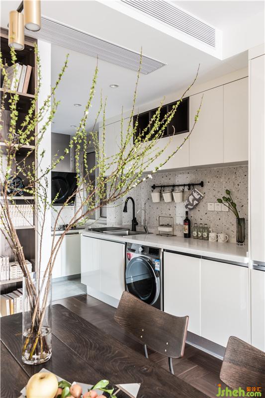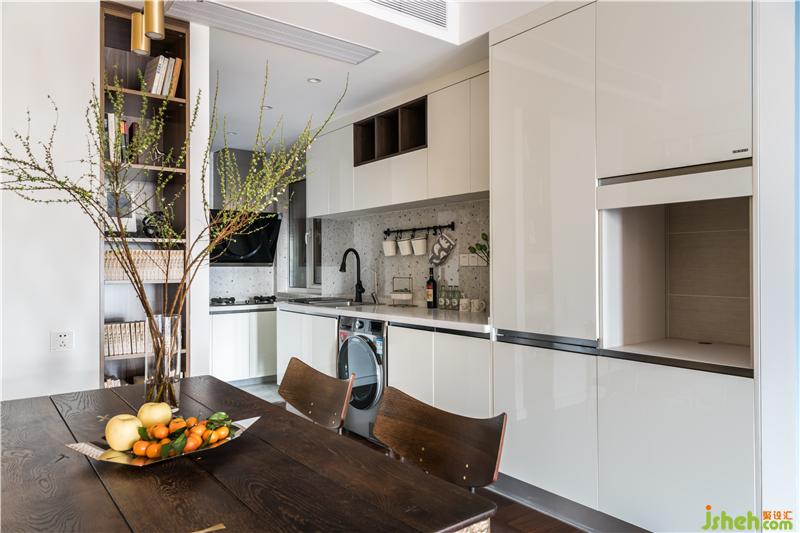 廚房設(shè)計(jì)中臺面和柜體全部使用了白色,這樣做的原因一是做到很好的反光效果,增加空間采光,面板的材質(zhì)采用烤漆板,質(zhì)感不錯(cuò)的同時(shí)耐磨耐用。西廚水槽旁邊設(shè)計(jì)了三排插座,解決廚房電器的電源需求,而洗碗機(jī)和洗衣機(jī)都做了嵌入式設(shè)計(jì),放進(jìn)西廚下方的柜子里,節(jié)省空間使用便捷。