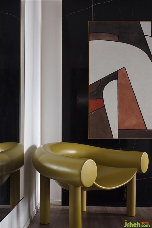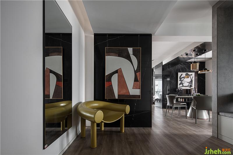 入戶自動(dòng)燈光設(shè)計(jì) 深色系的抽象畫(huà)和鏡面使空間顯得開(kāi)闊