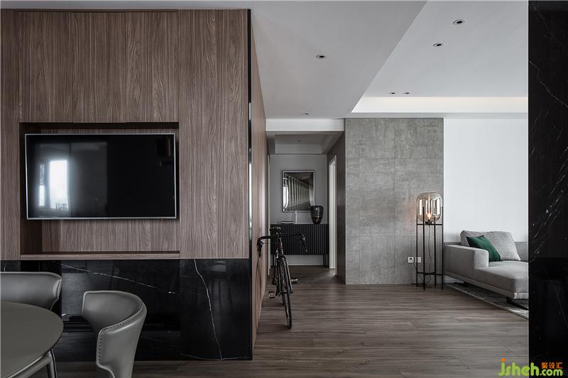 客廳的走廊和餐廳連接,大面積深色木飾面在這里的使用,和灰色水泥肌理墻板顯得十分和諧,柔和了這里區(qū)域空間的轉(zhuǎn)換,寬闊的走廊充分引入自然光線于室內(nèi),視覺(jué)也隨走廊而延伸,走廊盡頭的展示柜和藝術(shù)掛畫(huà),造成空間連續(xù)的視覺(jué)感知,有主有次的空間遞進(jìn)。