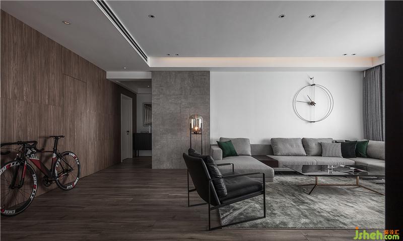 灰色調(diào)+木色的客廳區(qū) 地毯和沙發(fā)組合帶來(lái)安靜而沉穩(wěn)的感受