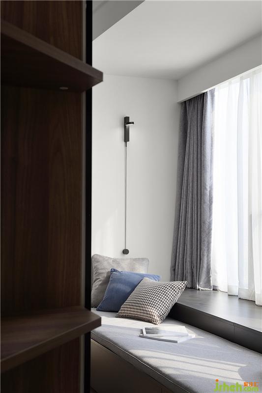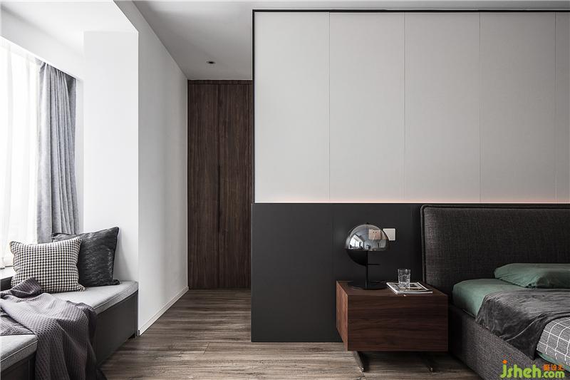 主臥的飄窗是改造后的陽臺,納入室內后整個空間十分寬敞,主臥背景墻是采用定制墻板,純白的部分結合隱藏燈帶,顯得十分有層次,深色系的床品和地毯結合白色的頂面框架,帶來視覺上的和諧美感。這里的主臥并不是封閉的一覽無余的,背景墻左邊是留出了一個進入衣帽間和主衛(wèi)的門。在不經(jīng)意處,暗藏玄機。