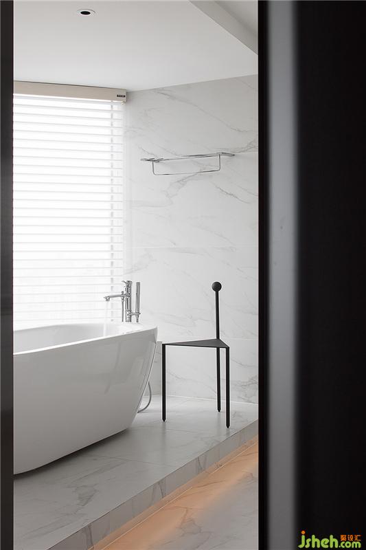 明亮的陽光透過大落地窗灑進這個純白浴室,地面與墻面都是大理石紋理的墻磚,結合白色頂面,整個空間顯露干凈無瑕的氣質,再加上落地窗浴缸的設計,白色雙洗手盆,讓人感覺誤入電影里的場景。大面積的純白里,入眼所見都是白色,沒有太多華麗的修飾,白色就是美的另一個表達。
