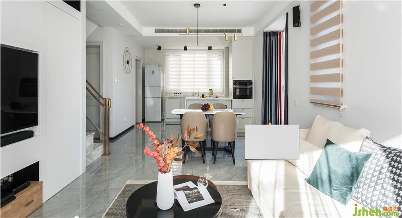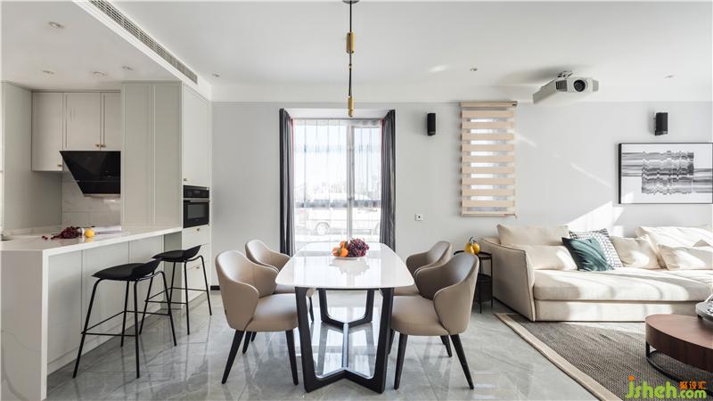 利用無墻體阻攔,空間開闊明亮的布局,把餐廳放在了休閑區(qū)和廚房的中間,這也是常使用的動線安排手法,好用方便,令人舒適的點是借助落地窗戶,餐桌在這里正對著窗外的景色,有著對稱的外景,陽光微風里,在這里用餐的心情可以非常愉悅。