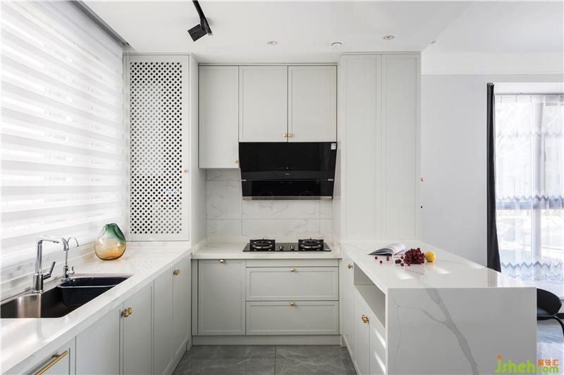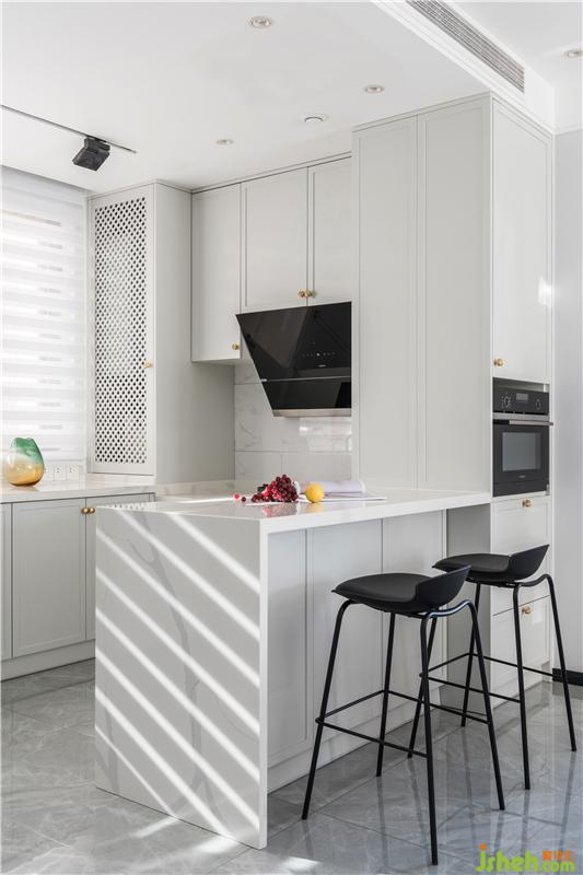 廚房結合吧臺的設計,滿足業(yè)主的多種需求,吧臺可以用作水吧區(qū),也可以作為早點和甜品的操作臺,柔和的質感結合精致的櫥柜線條,無主燈的設計使整個空間實現重點照明和分散式照明,嵌入式的設計讓廚房空間連為一體,啞光白色的柜體結合灰色瓷磚使空間更通透,也更加舒適自然。