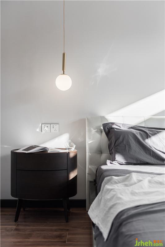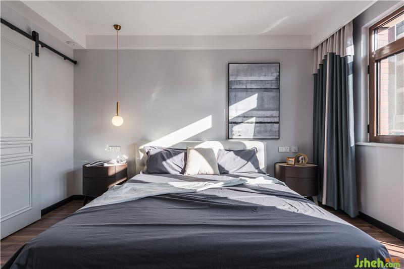 原來的主臥需要解決的問題就是面積固定,沒有衣帽間的地方,所以打通隔壁儲物間,借出來一部分面積我們把它作為了衣帽間,谷倉門推開就是一個步入式衣帽間,放主人的衣服和包袋行李,我們通過灰色乳膠漆墻面和無吊頂的處理,空間顯得干凈開闊,灰色墻面結合吊燈掛畫,高低錯落,整個空間被梳理出了層次,合理地設計后這里空間顯得十分有質感,吊燈燈光讓這個睡眠空間十分溫馨。