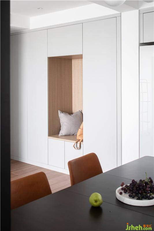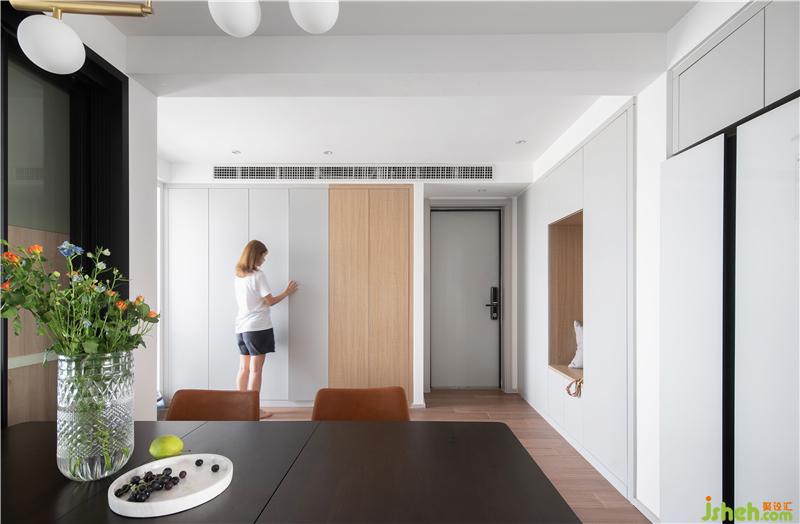 入戶是利用有限空間,塑造頂天立地的兩面收納墻,與整個空間渾然一體。不爭不搶沒有存在感,卻最大化的實現(xiàn)了廣闊收納空間,柜門開合之間,也留足了流暢的活動空間,木色與淺灰,材質(zhì)和顏色突出整個空間沉淀安靜的氣質(zhì)。