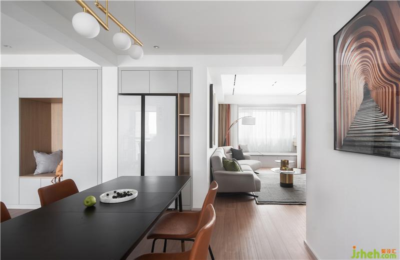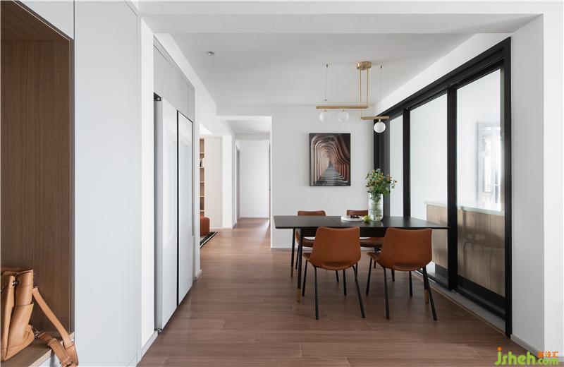 改變原始餐廳位置,將餐桌橫置,將入戶與餐區(qū)形成了流暢的過渡。同時廚房采用三聯(lián)活動門,全部打開時餐區(qū)與廚房又有一個更親密的聯(lián)通。
