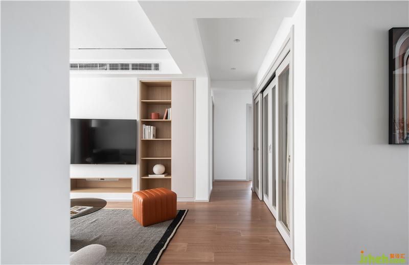 一個聯(lián)通的走廊,流暢串聯(lián)起來餐廚空間與客廳空間,使這里的空間感深邃。純白的射燈 頂面與女兒房的聯(lián)動門,豎線條也有如此美麗的體塊韻律。