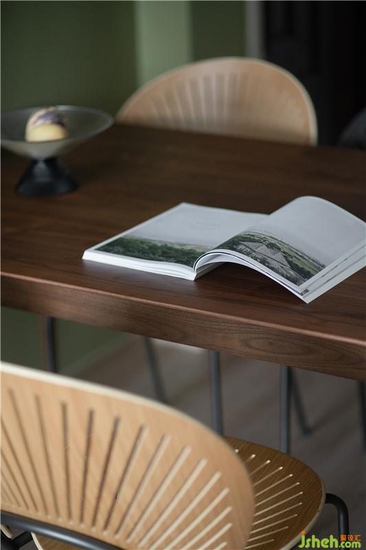 把舊電影的場(chǎng)景搬回家,空間主色調(diào)通過深色實(shí)木地板+復(fù)古綠墻面,帶來懷舊的氣質(zhì)。金色銅質(zhì)把手的邊柜,給這里增添幾分精致。
