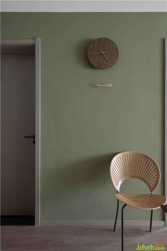 餐廳對(duì)面的走廊墻面,沒有過多的元素,一鐘一椅,達(dá)到盡量的簡(jiǎn)約與減壓。