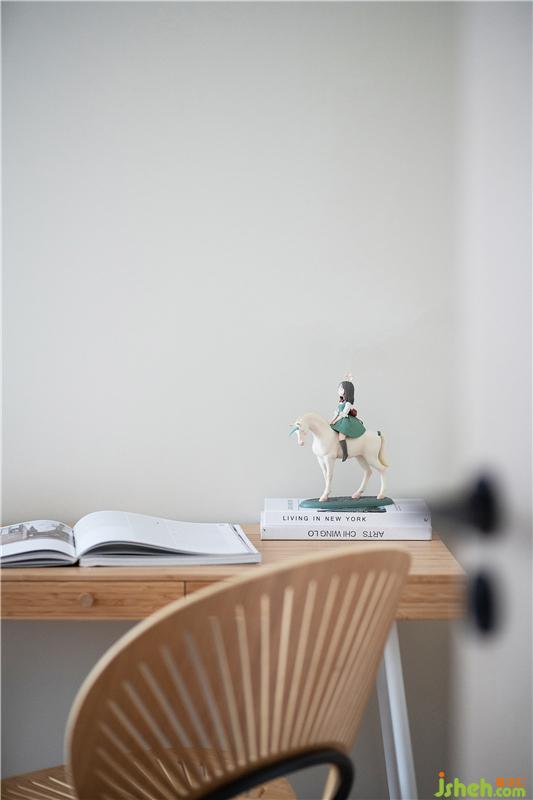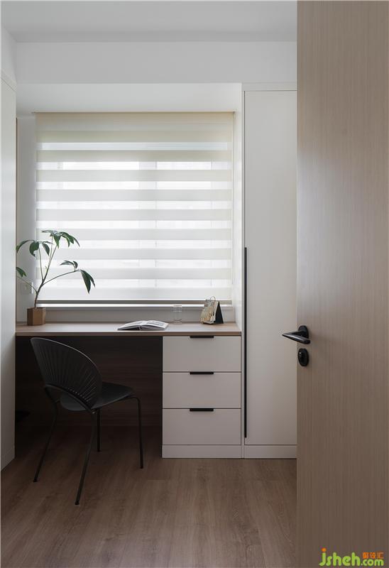 這是白色簡約控一定會喜歡的書房設計,百葉窗+開放格書桌,明亮舒適。為了解決女業(yè)主的衣物收納,這里還做了與墻頂高的衣柜,在有限的空間里精心實現了辦公和衣帽間功能的兼顧。