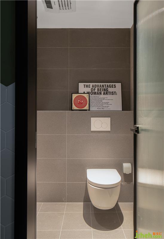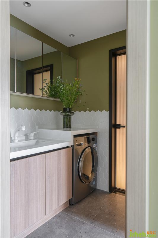 洗手間分為干濕分離的設計,干區(qū)六角磚的出現為衛(wèi)浴空間帶來一抹別致的體驗,一排小波浪的造型處理,區(qū)別于傳統(tǒng)的墻磚,在視覺上又能帶來獨特的美感。與復古綠墻面搭配,格外清爽。濕區(qū)的灰色素磚與長虹玻璃結合,空間透亮又利落。