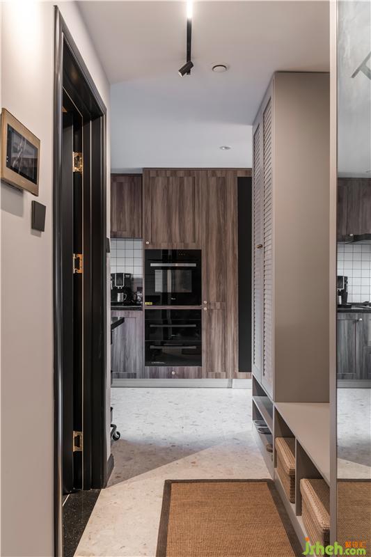 原始入戶是一條狹長的通道,左邊是樓梯,右邊是洗手間,無玄關(guān)的情況下,視覺上和使用都非常局促,設(shè)計師將洗手間原始干區(qū)取消,改造成為一個雙面使用的玄關(guān)隔斷,正面衣柜-鞋柜-座凳三者結(jié)合,完全滿足進門換鞋收衣服的需求,還有一面玄關(guān)鏡,整理儀容,非常好用。