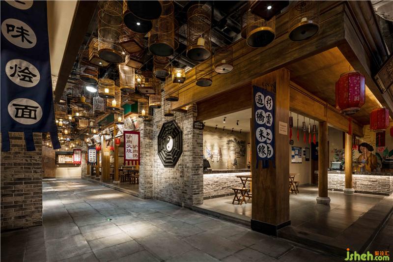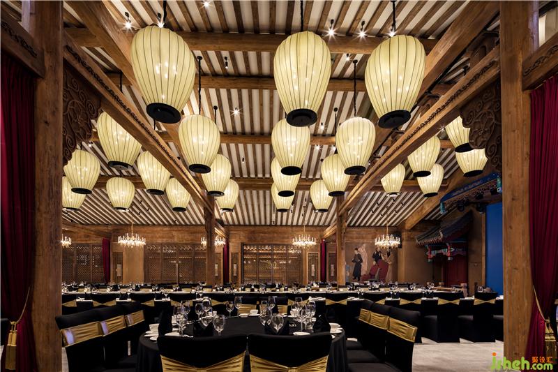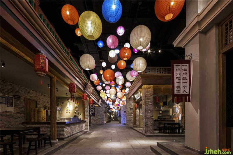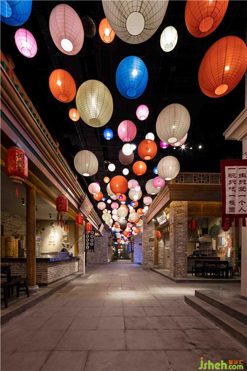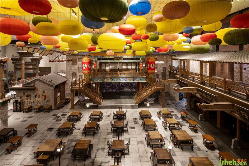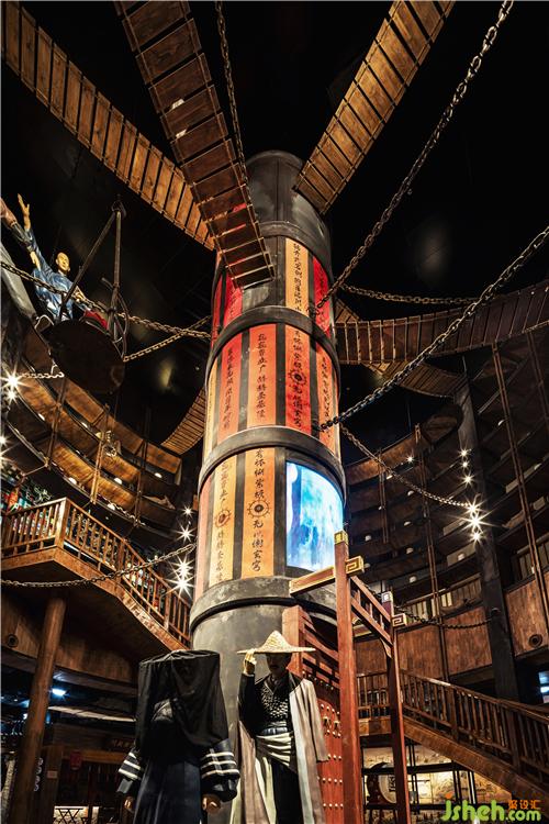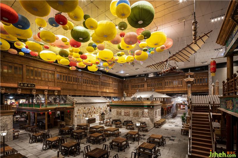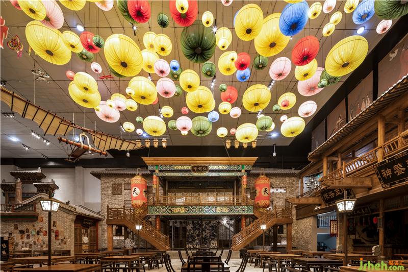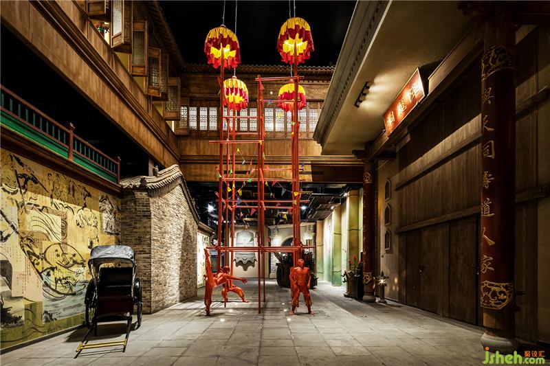 在一樓散廳、燈籠街等區(qū)域,我們大膽地運用了豐富的色彩來表現(xiàn)空間,從而打破了以往古城古建給人的傳統(tǒng)印象,使空間在講述歷史文化的同時,更具有特色和張力,成為了游客的記憶焦點。對于硬裝沒有考慮到的一些墻面和空間,我們結(jié)合電影場景,采用了原創(chuàng)墻繪等形式,既彌補了硬裝細節(jié)上的不足,又創(chuàng)造出了氣勢恢宏的劇場效果。