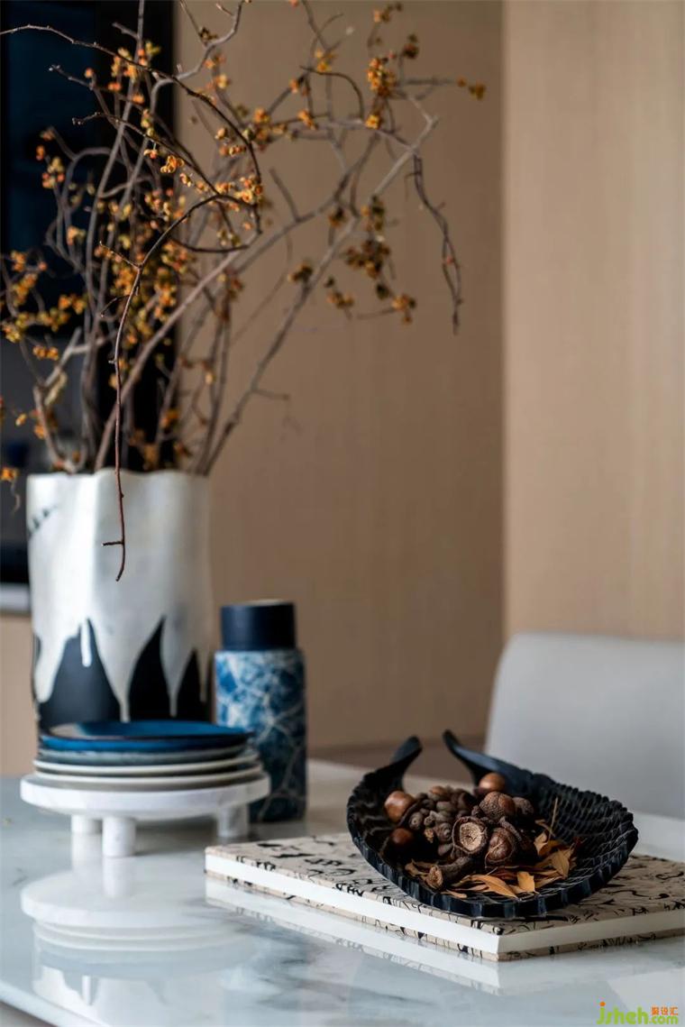 以青綠釉陶瓷為墨、樣板房設(shè)計(jì)以金色燈具為墨、以枯黃枝椏為墨、以緞面藝術(shù)絲帶為墨。