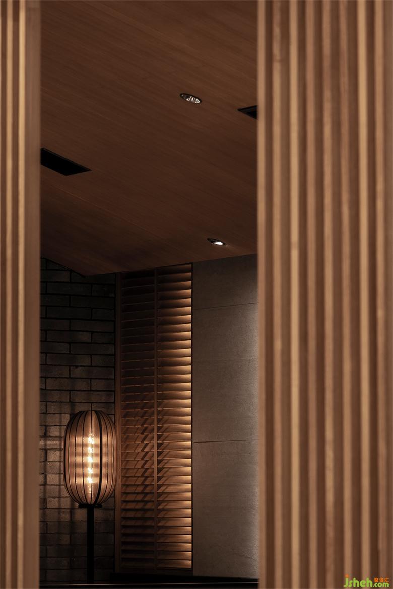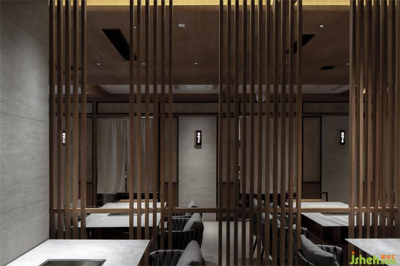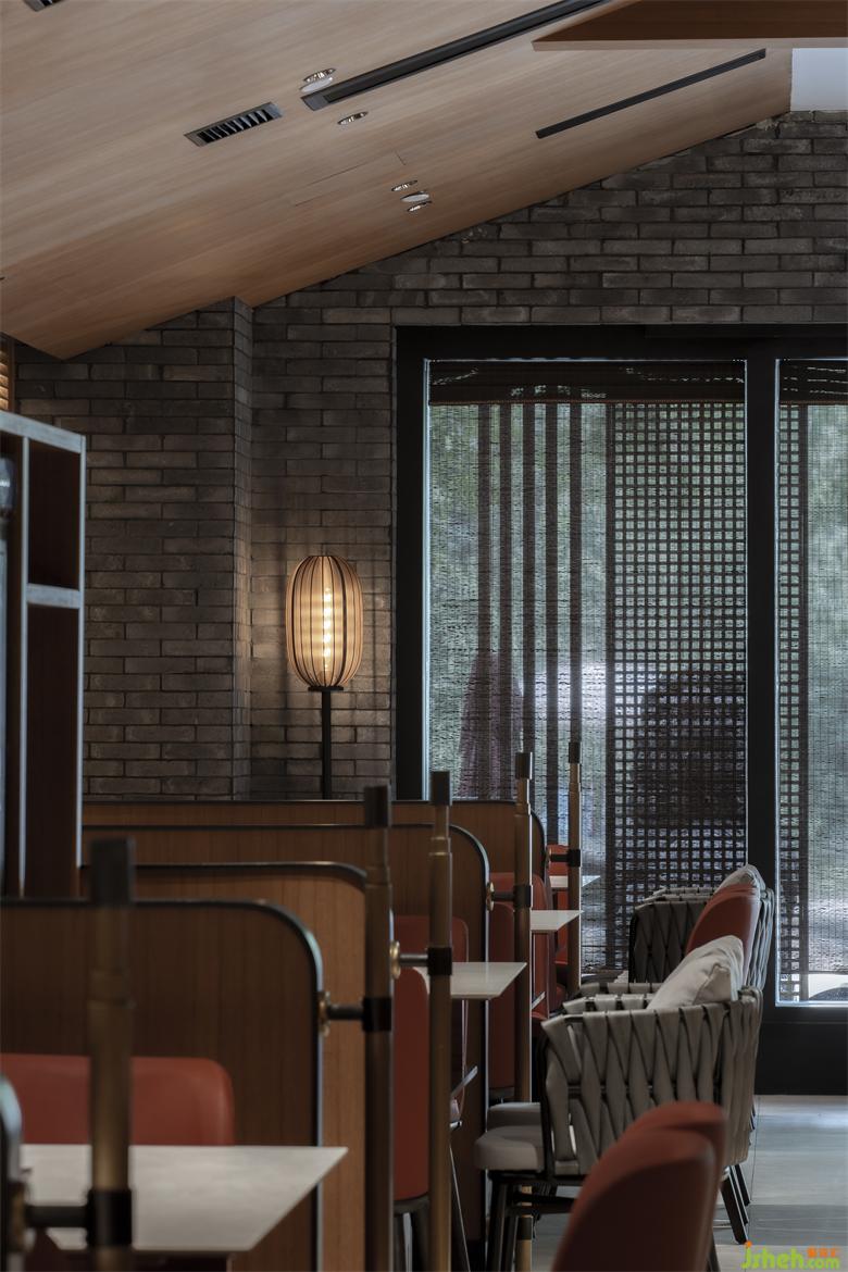 大廳右側(cè)為獨(dú)立的包房區(qū)域,玻璃窗與竹藝編制活動(dòng)推拉門相結(jié)合,成都餐廳設(shè)計(jì)兼顧了私密性與空間的通透性。