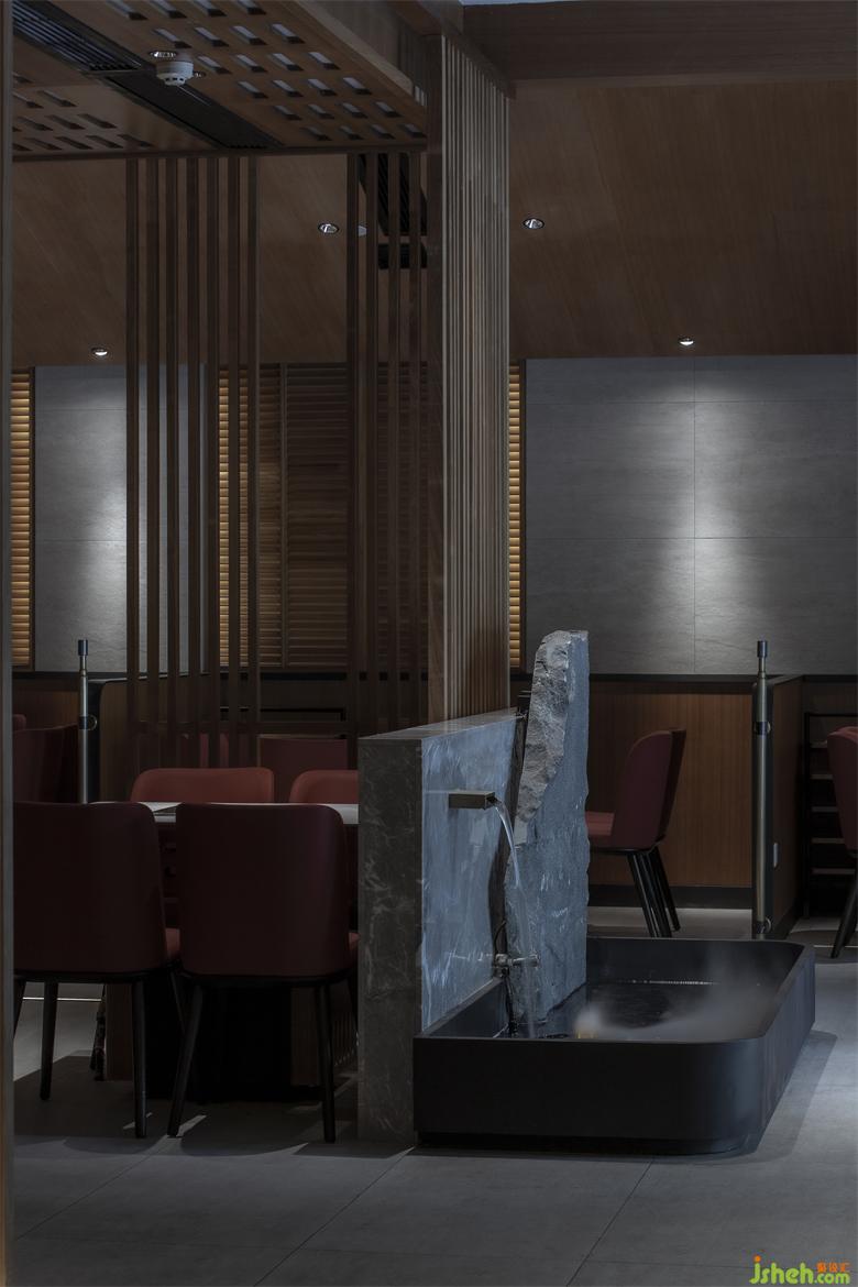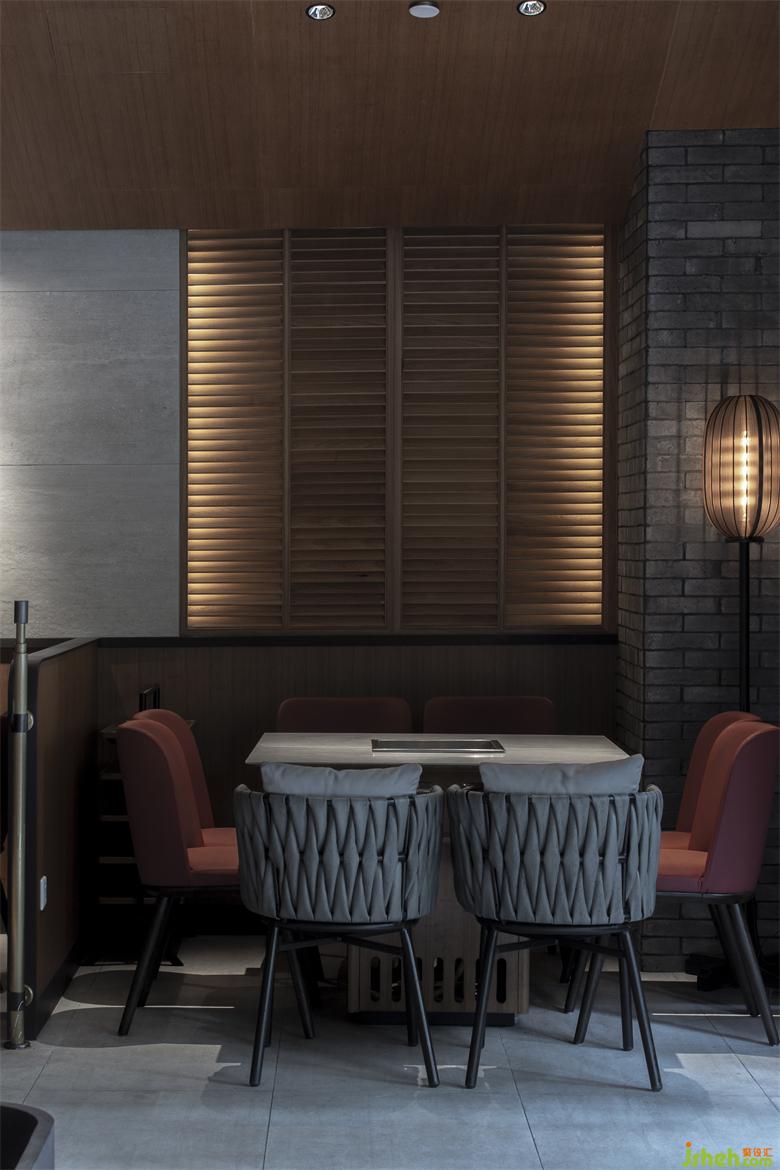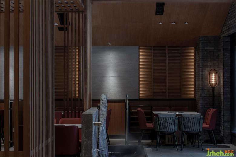 成都餐廳設(shè)計(jì)中盡可能的避免裝飾上堆砌的做法,用更精準(zhǔn)的材質(zhì)變化去定義空間。通過中間木隔斷這種看似單一的手法制造「空間的統(tǒng)一」,搭配家具紅/灰的色調(diào)保留了錦城印象「空間辨識(shí)度」。