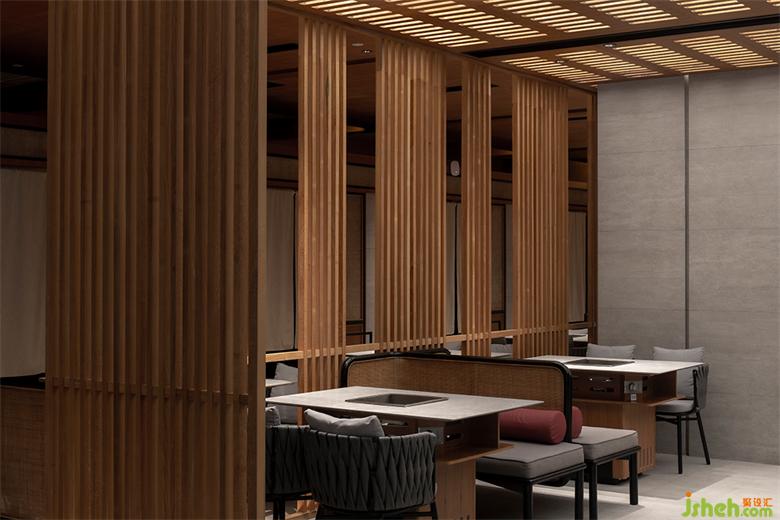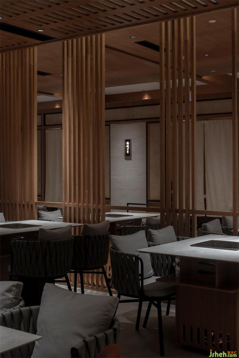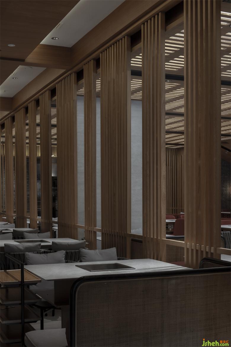保留特色同時也要滿足推陳出新的目的,融入年輕新潮的氛圍??此泼芗哪靖駯?,采用了「空間頂面透光」的手法,打造光與影的意境。成都餐廳設(shè)計格柵頂部透光方式將光線引入,漫散的光影,使空間層次渲染豐富。火鍋熱鬧的氛圍中,融入光影動勢,使空間更加廣闊并帶來生機(jī)的新鮮感。