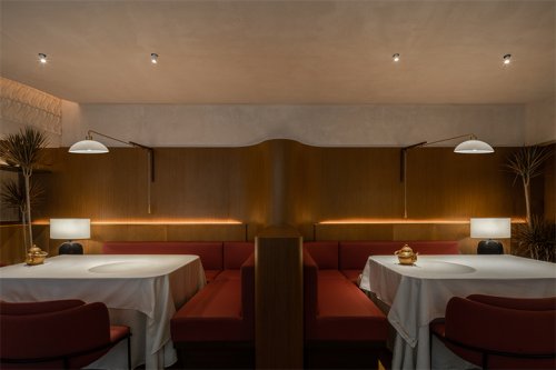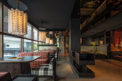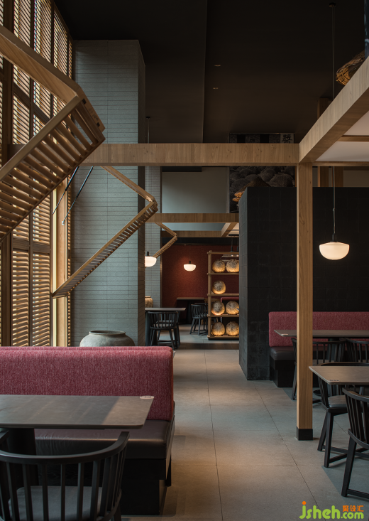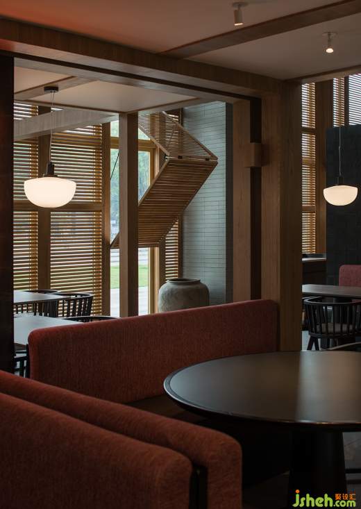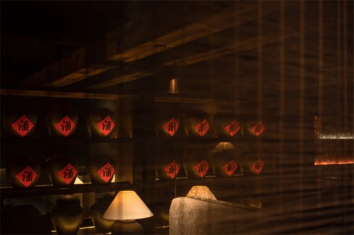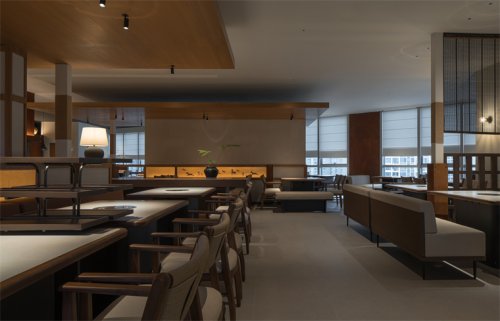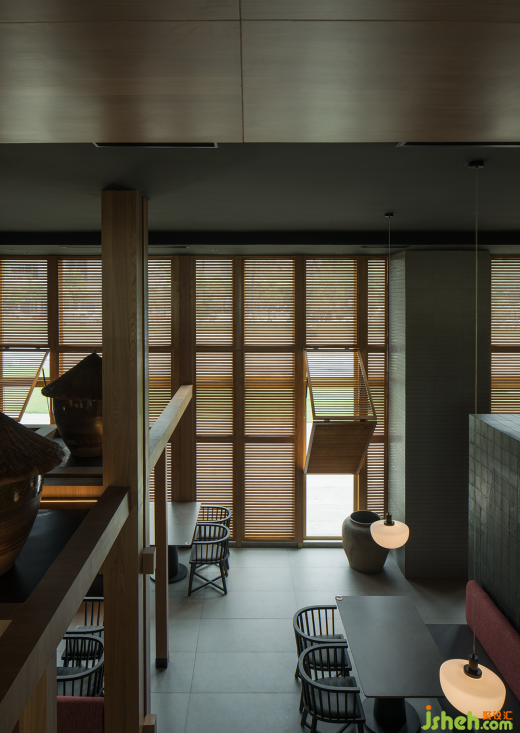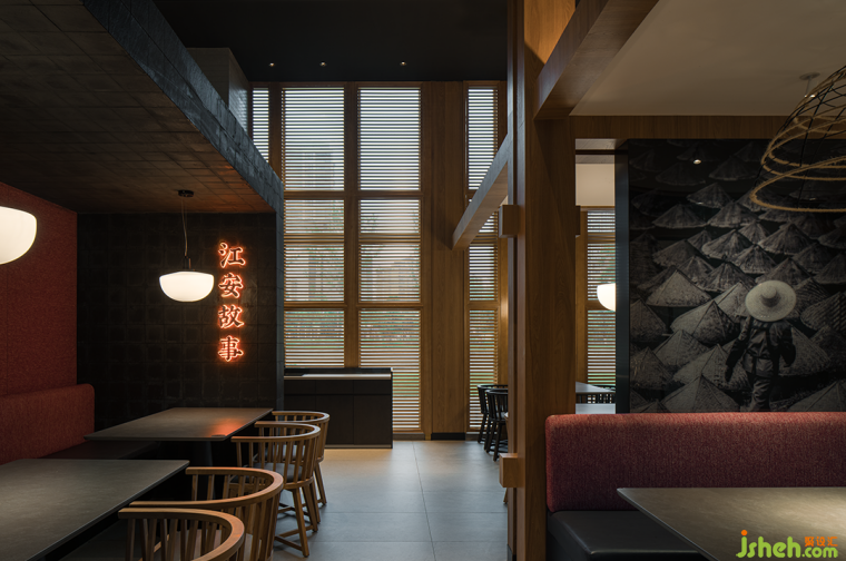 項目位于成都溫江區(qū)江安河畔,地理環(huán)境優(yōu)美,原始場地是偏弧形的全玻璃結(jié)構(gòu)建筑。室內(nèi)面積1050㎡,整體玻璃展面達40米,梁下層高4.9米左右,無疑項目本身的展面、視野、采光都是很好的,但隨之帶來的問題是日照過強的時候靠玻璃面幾乎無法入座,項目自身功能需求如廚房、包間、衛(wèi)生間形成的體塊關(guān)系可以解決一部分遮擋,配合質(zhì)樸、煙火氣的品牌基調(diào),我們用可折疊木格柵窗來解決大廳遮陽問題,無陽光時質(zhì)樸寧靜,烈日下光影強烈、氛圍感十足。