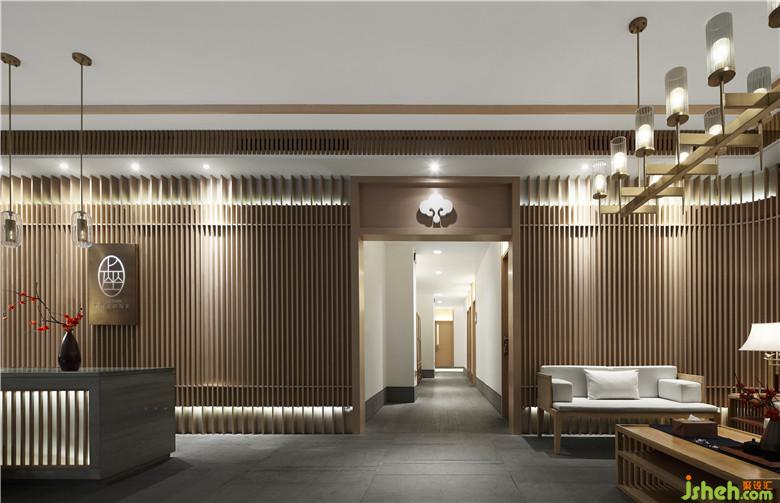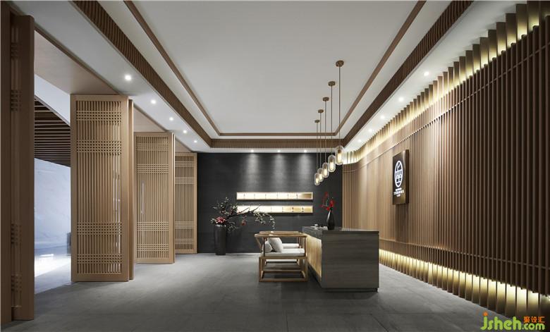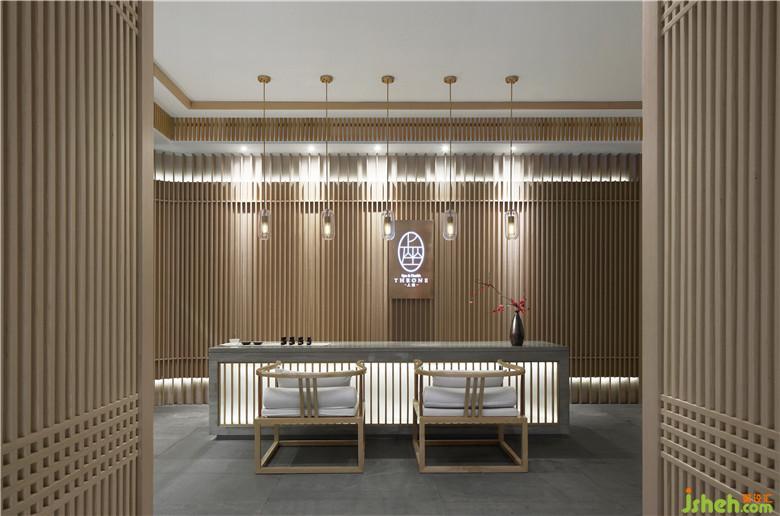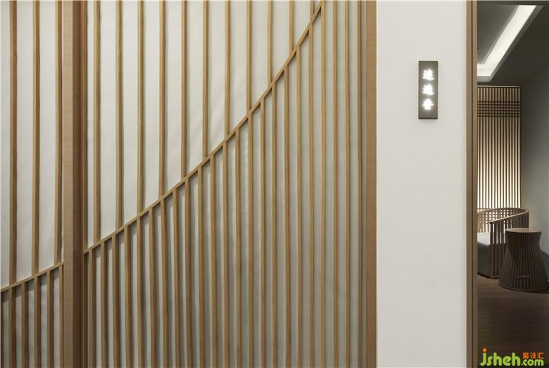 設(shè)計師運用原木色貫穿整個空間,有序的隔柵線條與墻面結(jié)合,達到整體效果的延伸。定制的純銅LOGO,露出光的微茫,既突出了主題,又為空間增添了些許高級感。