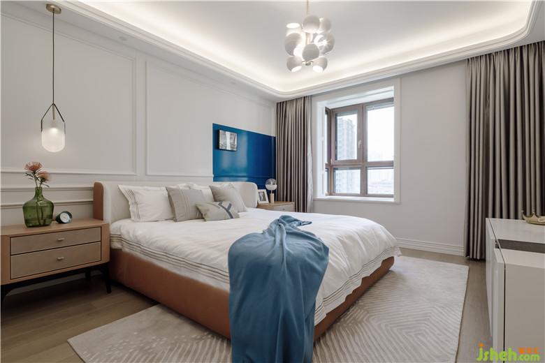 主臥,一半海水一半火焰,橘色與藍(lán)色,熱情與冷靜結(jié)合的天衣無縫。米咖色地毯立體感十足,與高光的深灰色窗簾遙相呼應(yīng)。