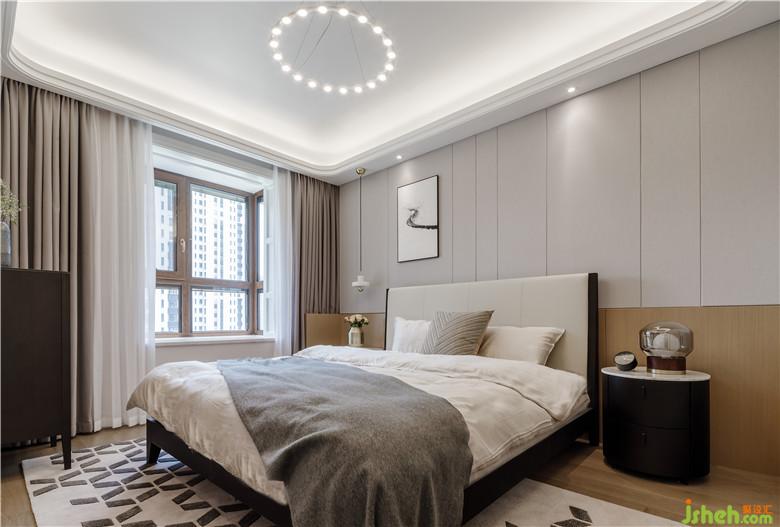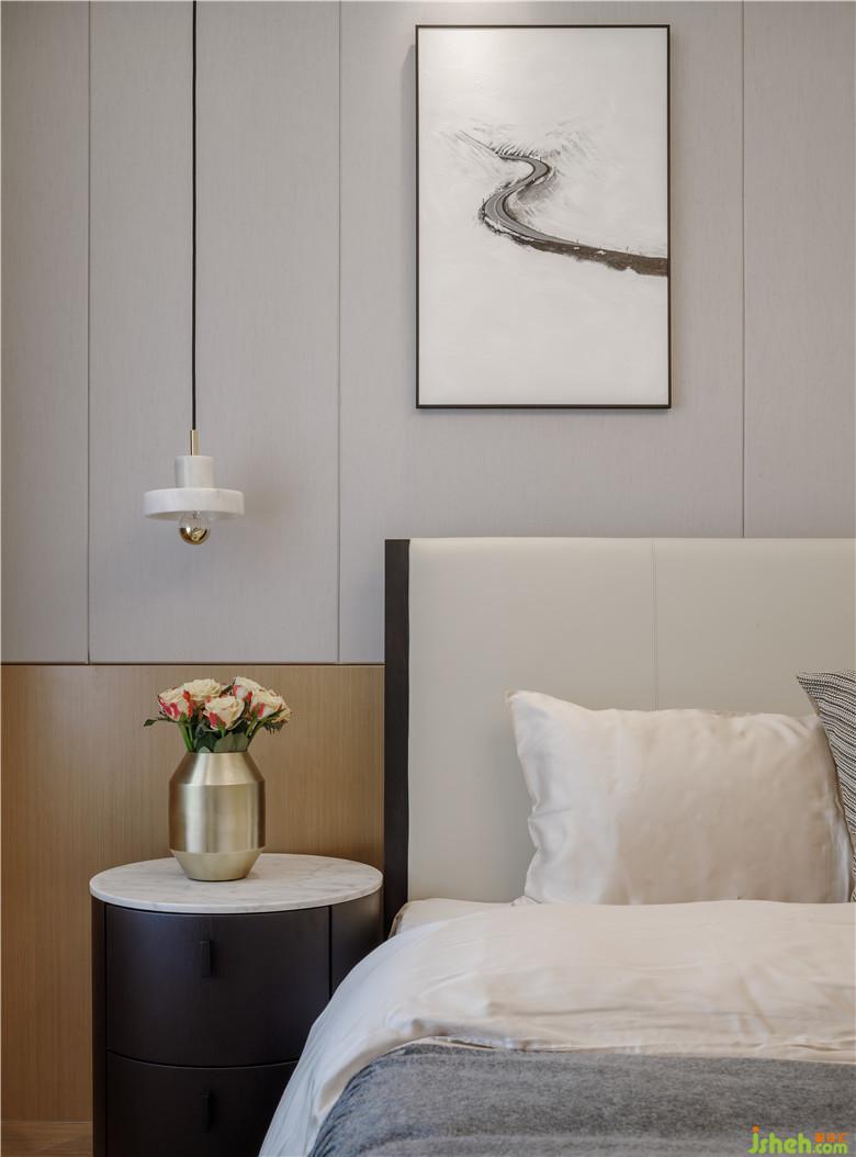 次臥硬包背景,大小不一,井然有序。與幾何形狀的地毯形成反差,只一副高空俯瞰的山脈畫作,便起到了吸睛的作用。宛若星辰的下掛燈,仿佛給予我勇氣,指引我們找到愛的方向…