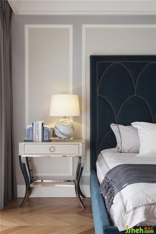 靜謐安逸的淺灰從臥室延伸至次衛(wèi),以高貴的孔雀藍作為亮點,一改長輩房固有的沉悶氣氛,增添了一絲藝術氣息。