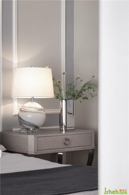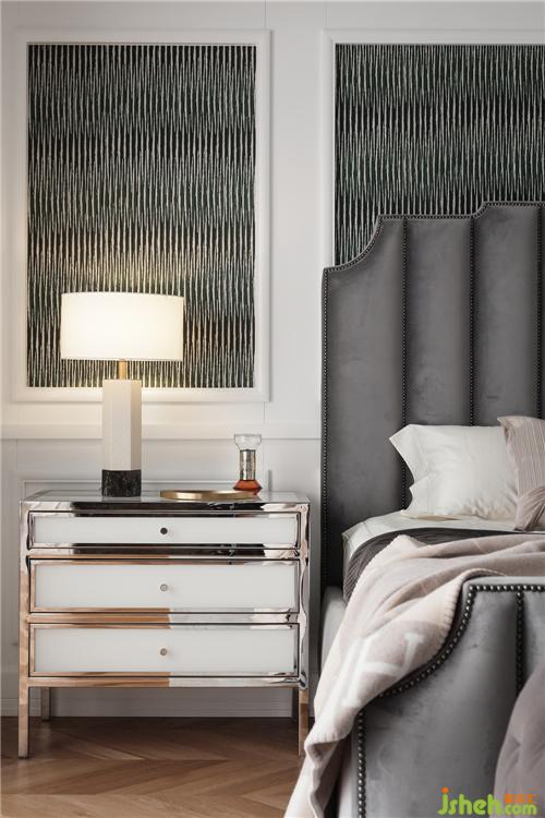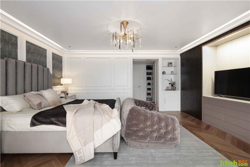 主臥選用女主人心儀的深灰+裸粉色調(diào),高貴精致、優(yōu)雅成熟。原木色地板充滿溫暖的親切感,與色調(diào)上的冷、淡,相中和。