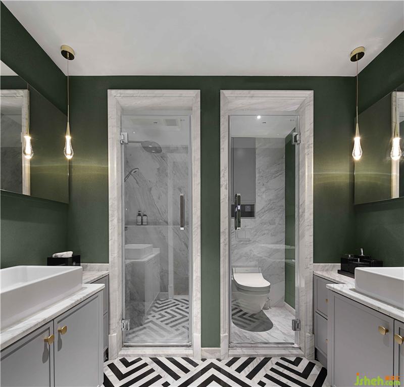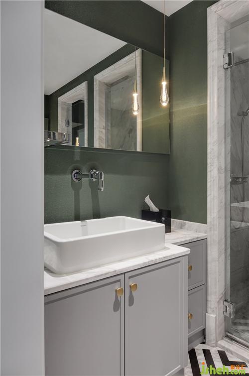 主衛(wèi)干濕分離,極具私密性。南京別墅裝飾與臥室背景墻、窗簾所運用的墨綠色相呼應,斑馬紋地磚的植入也凸顯一絲俏皮。擁有八個置物抽屜的洗漱柜有著超強的收納空間,充分滿足女主人放置護膚品的需求。